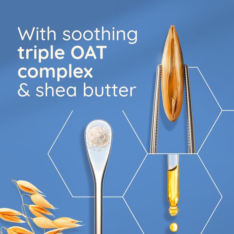 Aveeno Skin Relief lotion indeholder blandt andet sheasmør og et præbiotisk tredobbelt havrekompleks bestående af havremel, havreekstrakt og havreolie, der hjælper med at balancere hudens naturlige mikrobiom og genopretter hudbarrieren. Dette gør huden spændstig og får huden til at se sund ud.