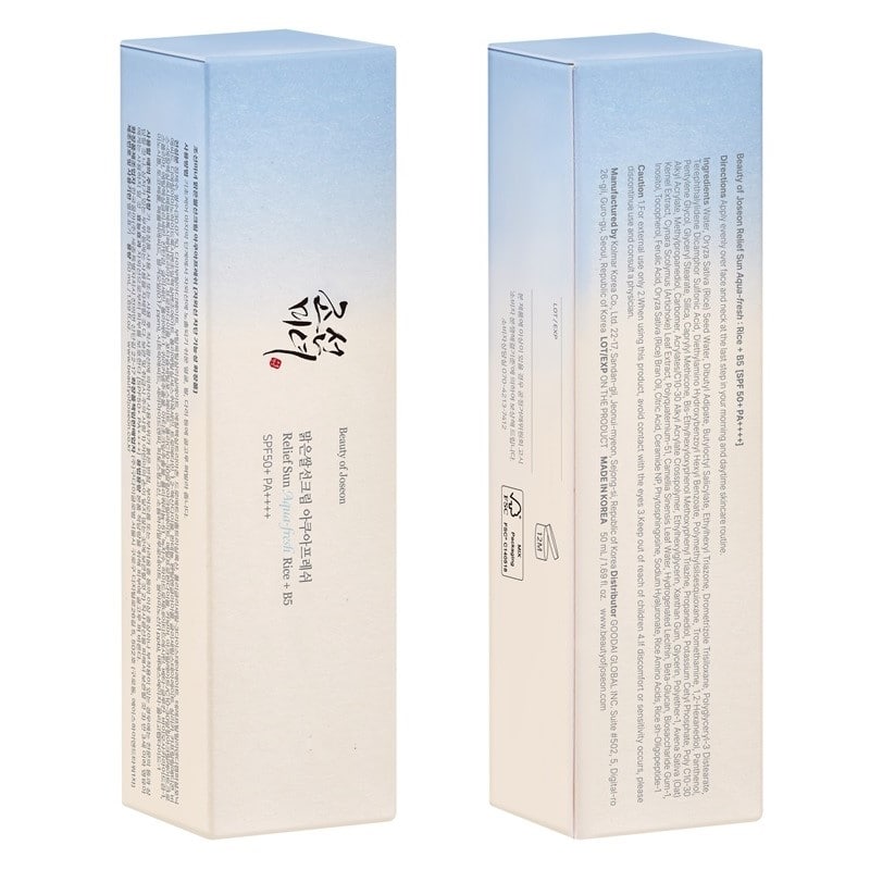 Beauty of Joseon Relief Sun Aqua Fresh SPF50+ PA++++ er en forfriskende, fugtgivende solcreme med risfrøvand og panthenol, der beskytter din hud mod skadelige UV-stråler og miljøfaktorer. Den er hurtigtabsorberende med en dewy finish.
