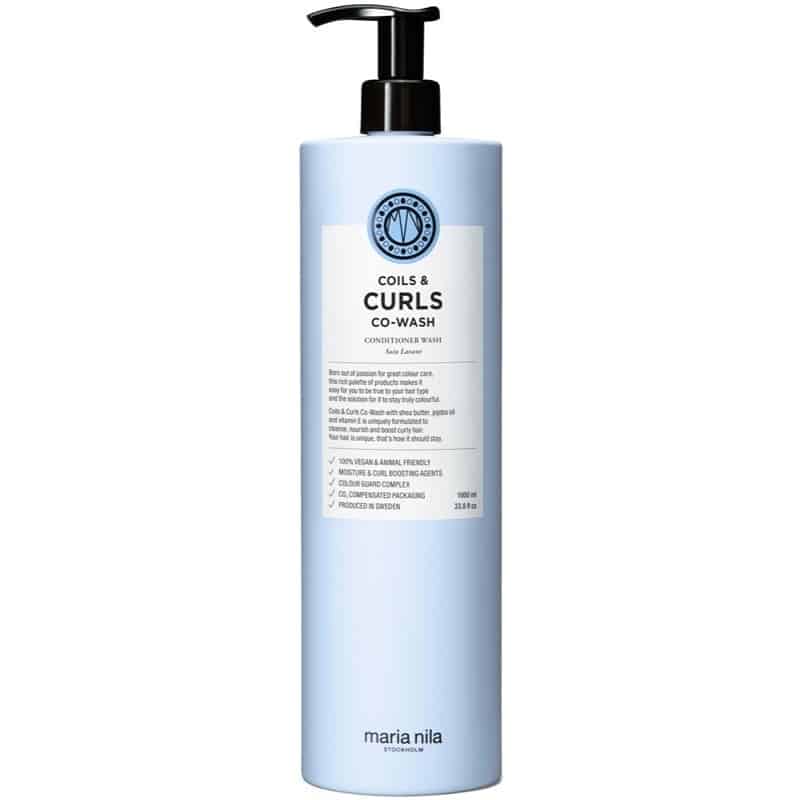 Maria Nila Coils & Curls Co-Wash er en fugtgivende og udredende shampoo og balsam i ét, udviklet til alle typer krøllet hår. Den skånsomme Co-Wash indeholder sheasmør, jojobaolie, aloe vera og E-vitamin, som plejer både hår og hovedbund, rengør skånsomt og efterlader håret blødt og glat.