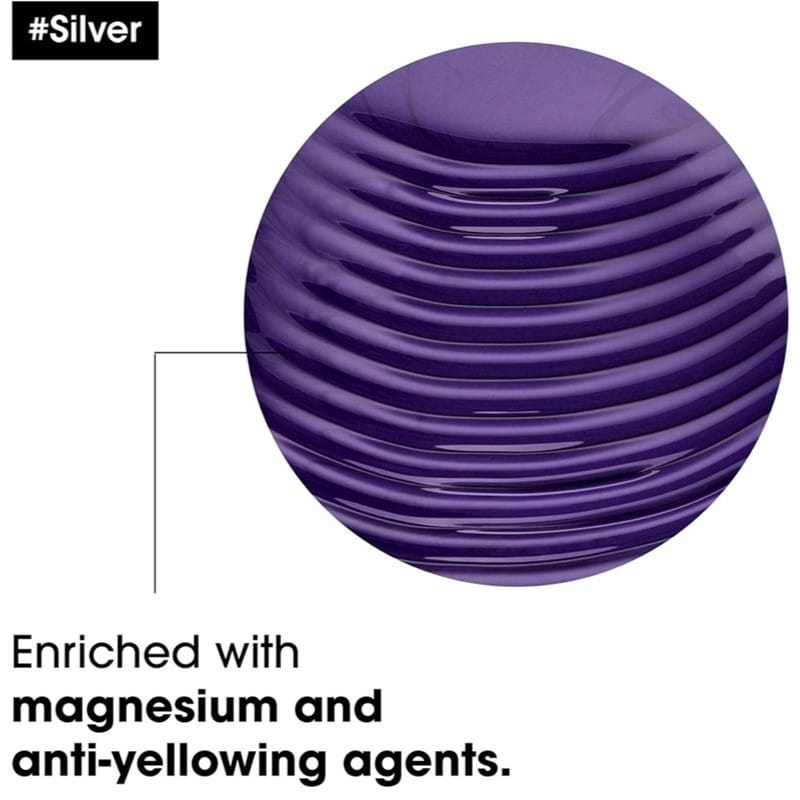 L’Oreal Professionnel Serie Expert Silver Shampoo on neutraali vaalentava shampoo harmaalle ja valkoiselle hiukselle. Rikastettu violetilla pigmentillä ja magnesiumilla*. Yhdistelmä keltaisuutta neutraloivia aineosia, jotka neutraloivat ja poistavat keltaiset sävyt. Hiukset tuntuvat pehmeiltä ja näyttävät kiiltäviltä. *Magnesiumasetaatti. L’Oréal Professionnel Serie Expert toimii ympäristön vähäisemmän vaikutuksen puolesta. Uudelleensuunniteltu pakkaus, jossa on 95% kierrätettyä muovia ja kevyempi pakkaus.