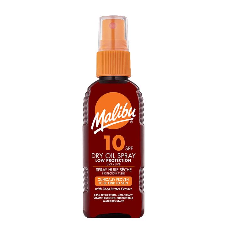 Malibu Dry Oil Spray SPF 10 antaa heikon suojan UVA- ja UVB-säteitä vastaan. Se on valonkestävä öljy, jonka on kliinisesti todistettu olevan lempeä useimmille ihotyypeille. Lisäksi se on rikastettu vitamiinilla, vettä hylkivä, kuiva rakenne ja helppo levittää koko vartalolle.