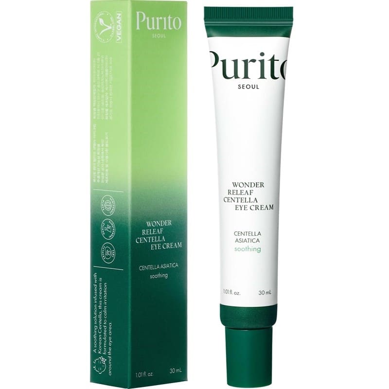 Purito Wonder Releaf Centella Eye Cream – täydellinen silmänympärysvoide herkän silmänympärysihon ravitsemiseen ja kosteuttamiseen! Tämä erityisen hellävarainen silmänympärysvoide on koostettu 49% centella asiatica -uutteella, peptideillä, sheavoilla ja hyaluronihapolla, jotta se tarjoaisi voimakkaan ikääntymistä estävän vaikutuksen.