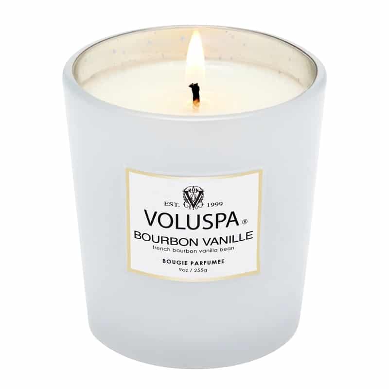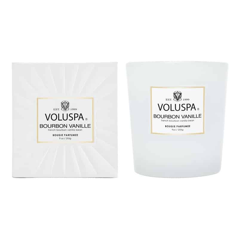 Voluspa Classic Boxed Candle Bourbon Vanille -kynttilässä on pehmeä ja kermaisa tuoksu bourbon-vaniljapapujen.