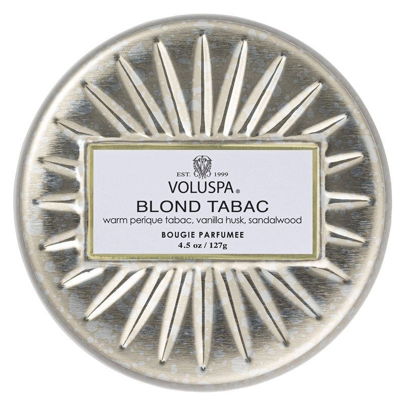 Voluspa Decorative Tin Candle Blonde Tabacissa on mausteinen tupakan, vaniljatankojen ja santelipuun tuoksuä