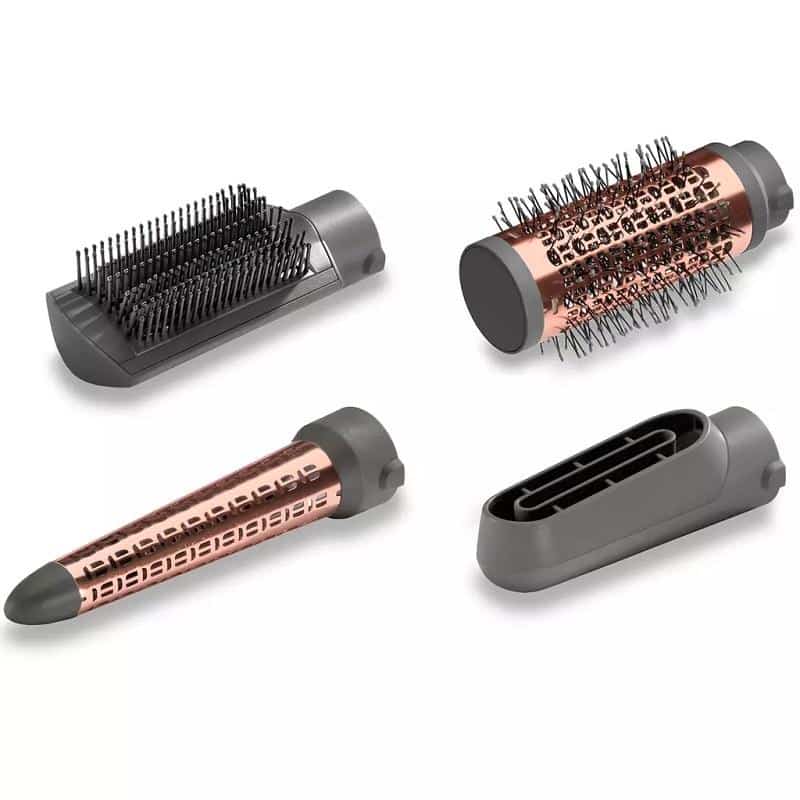 Volumbørste med 50 mm diameter og varme som former håret og gjør det fyldig. Conform krølltilbehør som enkelt lager myke krøller og bølger. Stor hårbørste som retter ut og flater ut håret og gir et glatt og skinnende resultat. Blåsemunnstykke for tørking av håret før styling.