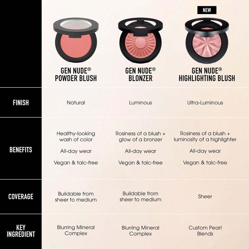 BareMinerals Gen Nude Highlighting Blush er en 2-i-1 hybrid av rouge og highlighter som kombinerer den rosige fargen fra et rouge med «gløden» fra en highlighter – i ett steg.