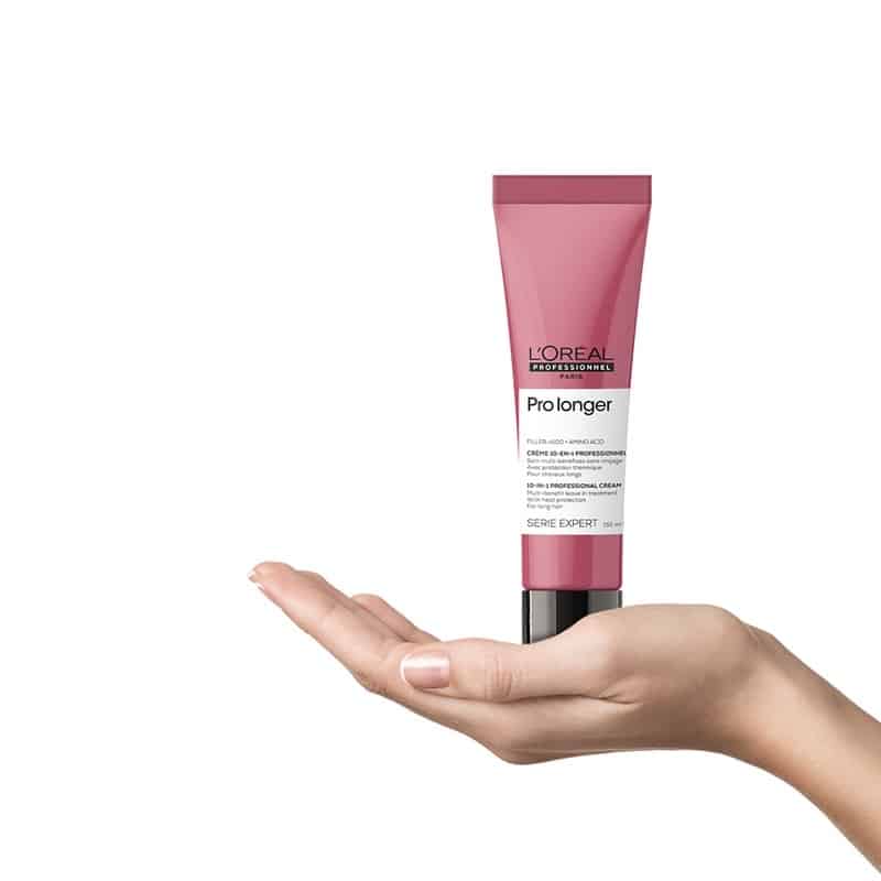 L’Oréal Professionnel Serie Expert Pro Longer 10-in-1 Cream er en lengdefornyende krem for lengder og tupper, med patentert Filler-A100-teknologi og aminosyrer. Passer for langt hår som lider av tynne tupper. Kremen gir beskyttelse mot frizz og hjelper til med å fornye hårfibre umiddelbart, samtidig som den beskytter håret mot varme opptil 230°C*. Den profesjonelle formelen styrker hårfibrene med mindre skade, fra rot til tupp. *Instrumentell test.