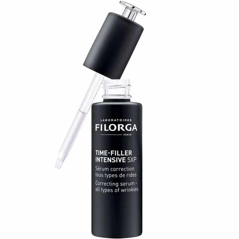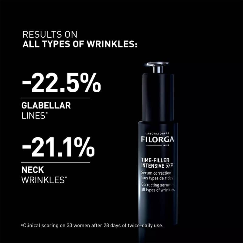 Filorga Time-Filler Intensive 5XP Serum är ett anti-aging-serum som arbetar för att släta ut fem typer av rynkor och fina linjer. Formulan innehåller FILORGAs 5XP-komplex som är inspirerat av estetiska behandlingar, och dess avslappnande effekt främjar omedelbar och långvarig korrigering av uttryckslinjer, djupa rynkor, ytliga rynkor, torrhetslinjer och halsrynkor. Den silkeslena texturen glider lätt över huden och ger en uppfriskande känsla. Kliniska studier har påvisat imponerande resultat: 97% rapporterade en omedelbart utjämnande effekt och att huden såg slätare ut efter första appliceringen. Efter 7 dagars användning upplevde 94% att ansiktsdragen såg mjukare ut, och efter 28 dagar upplevde 82% att deras rynkor var mindre framträdande.*